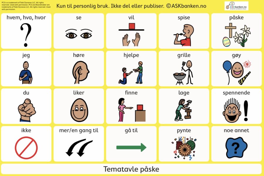Tematavle for å kunne snakke om påske, enten i situasjonen, som en forberedelse, eller som gjenkalling etterpå. Mange av aktivitetene vi gjør i påsken, er også en naturlig del av hverdagen – som å lage mat, være ute, pynte, besøke familie eller kle seg ut.